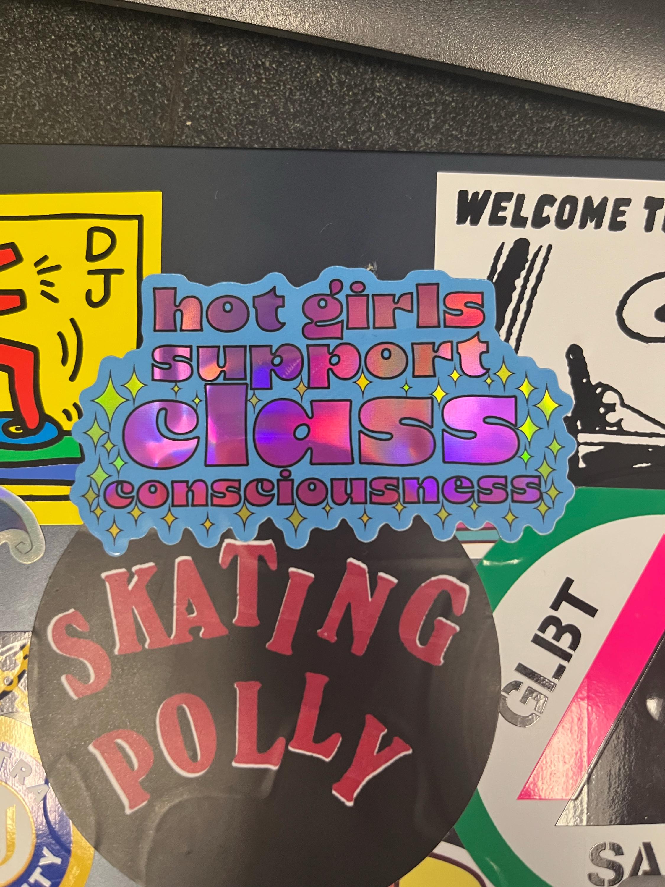 hot girls support class consciousness holographic sticker | for waterbottles laptops | working class solidarity | leftist babe comrade coded