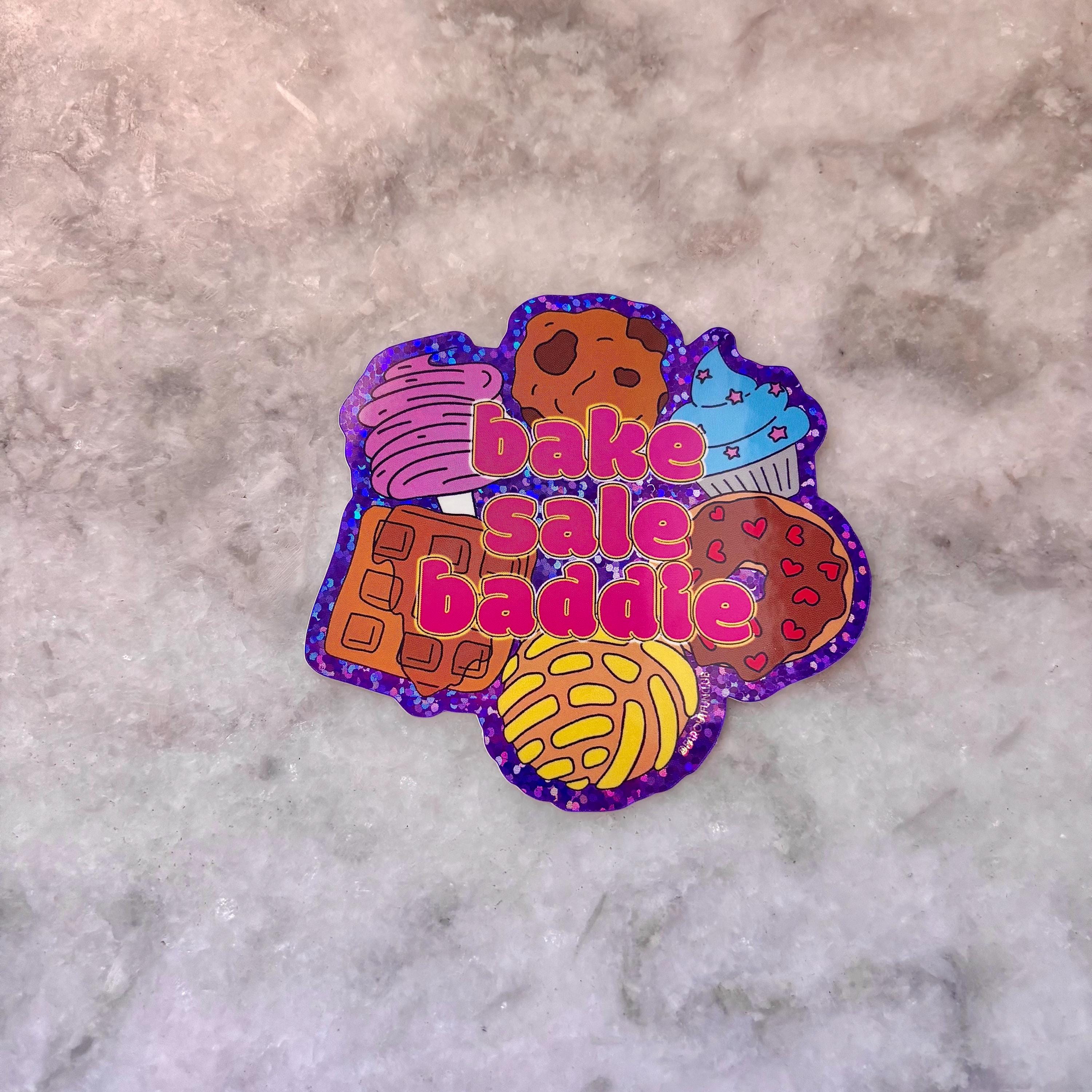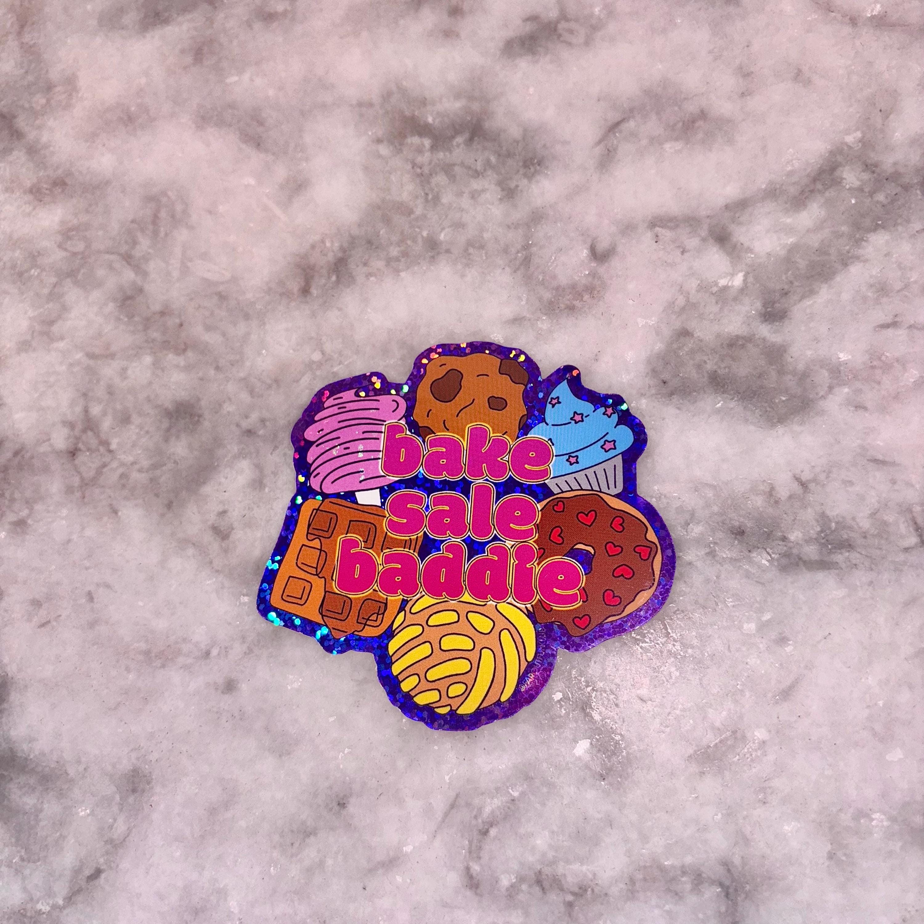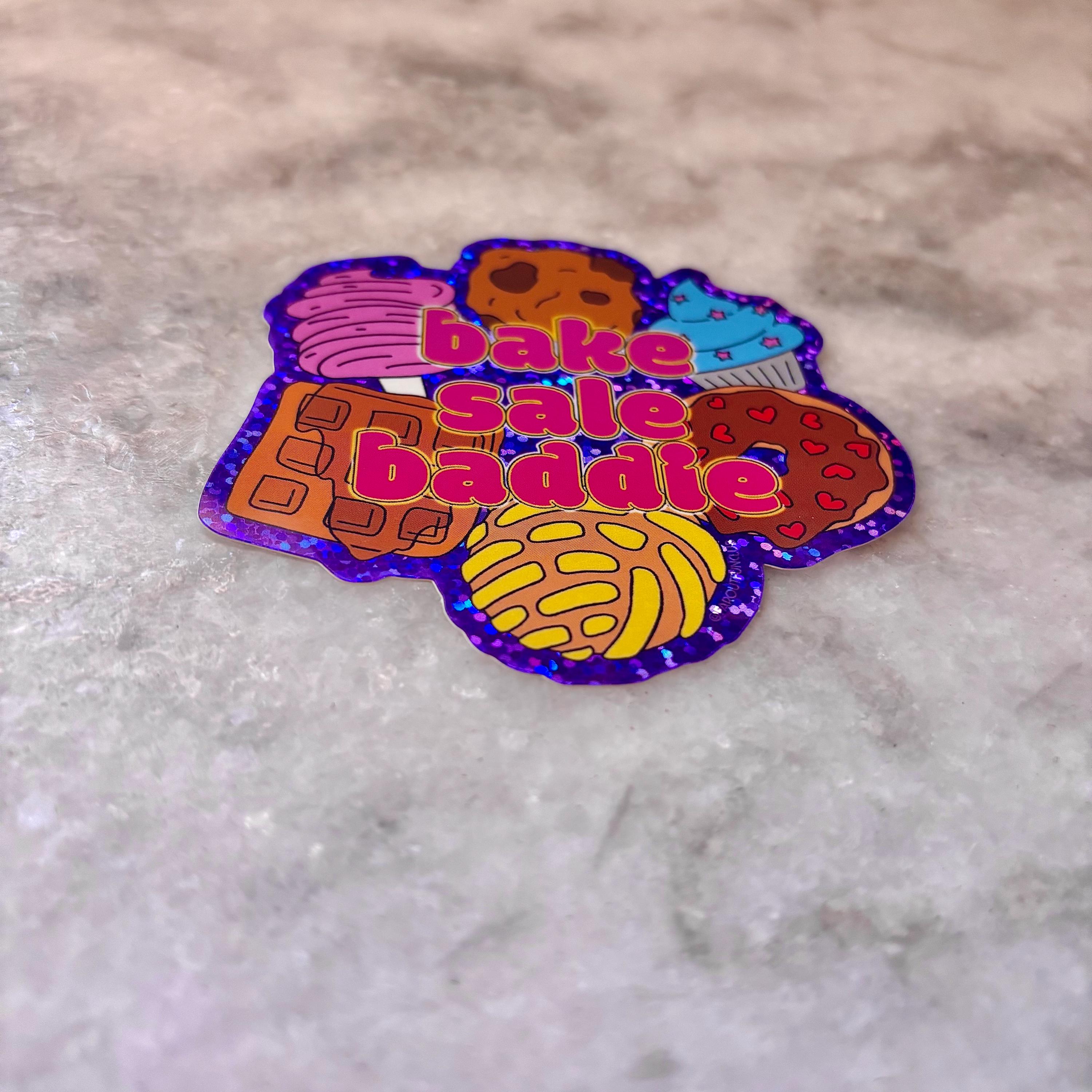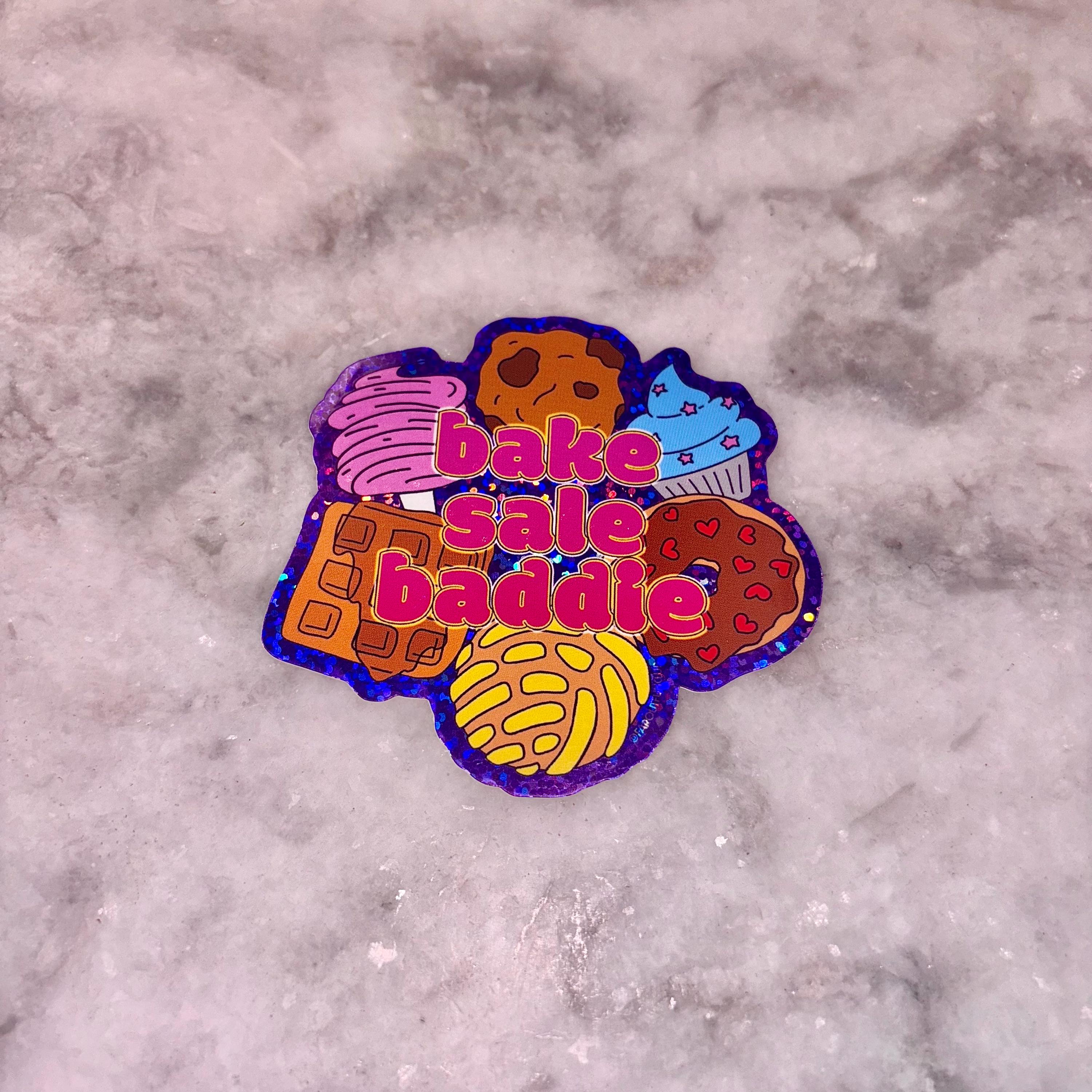 bake sale baddie glittery holographic sticker | for waterbottles laptops | concha waffle donut baked goods fan | cotton candy cupcake queen