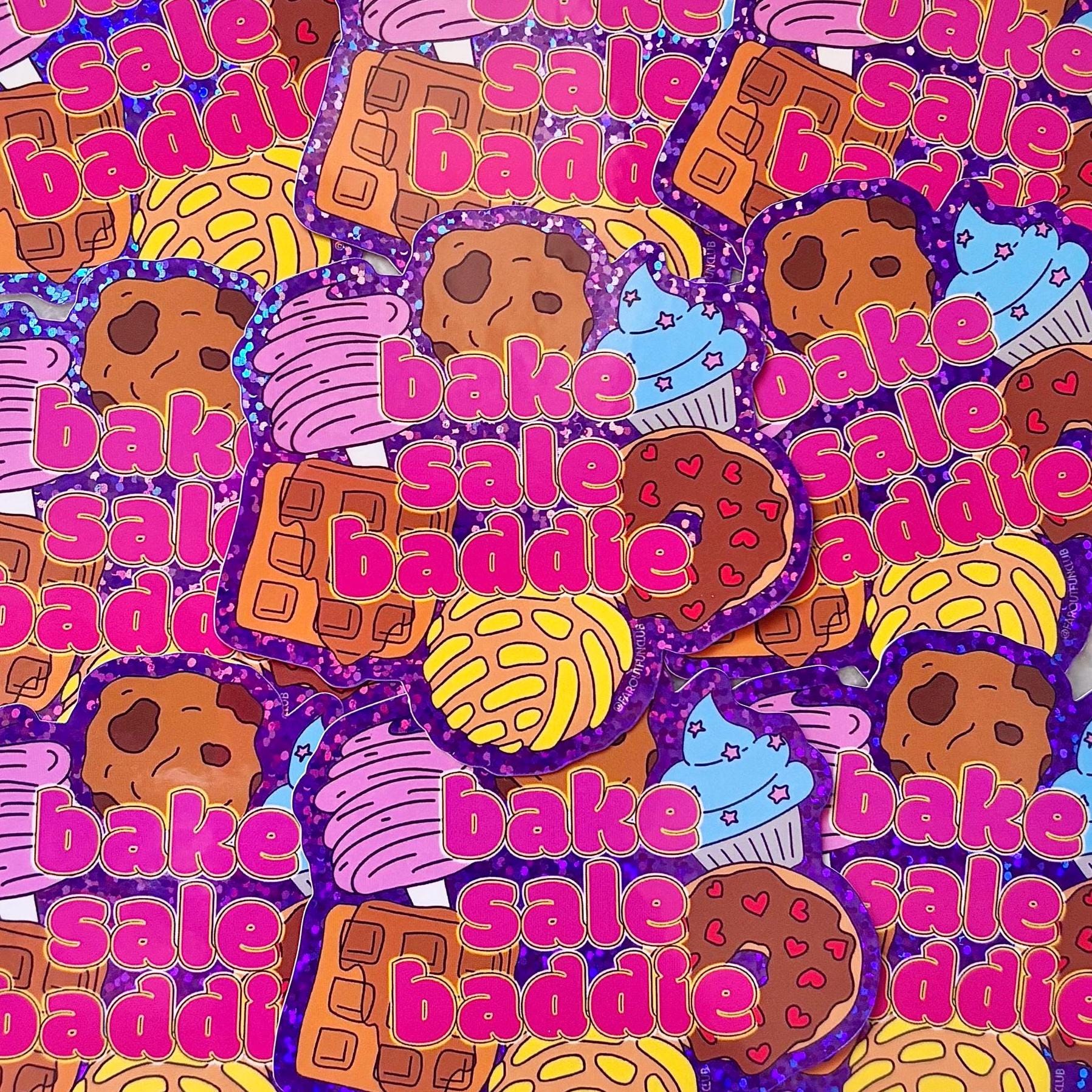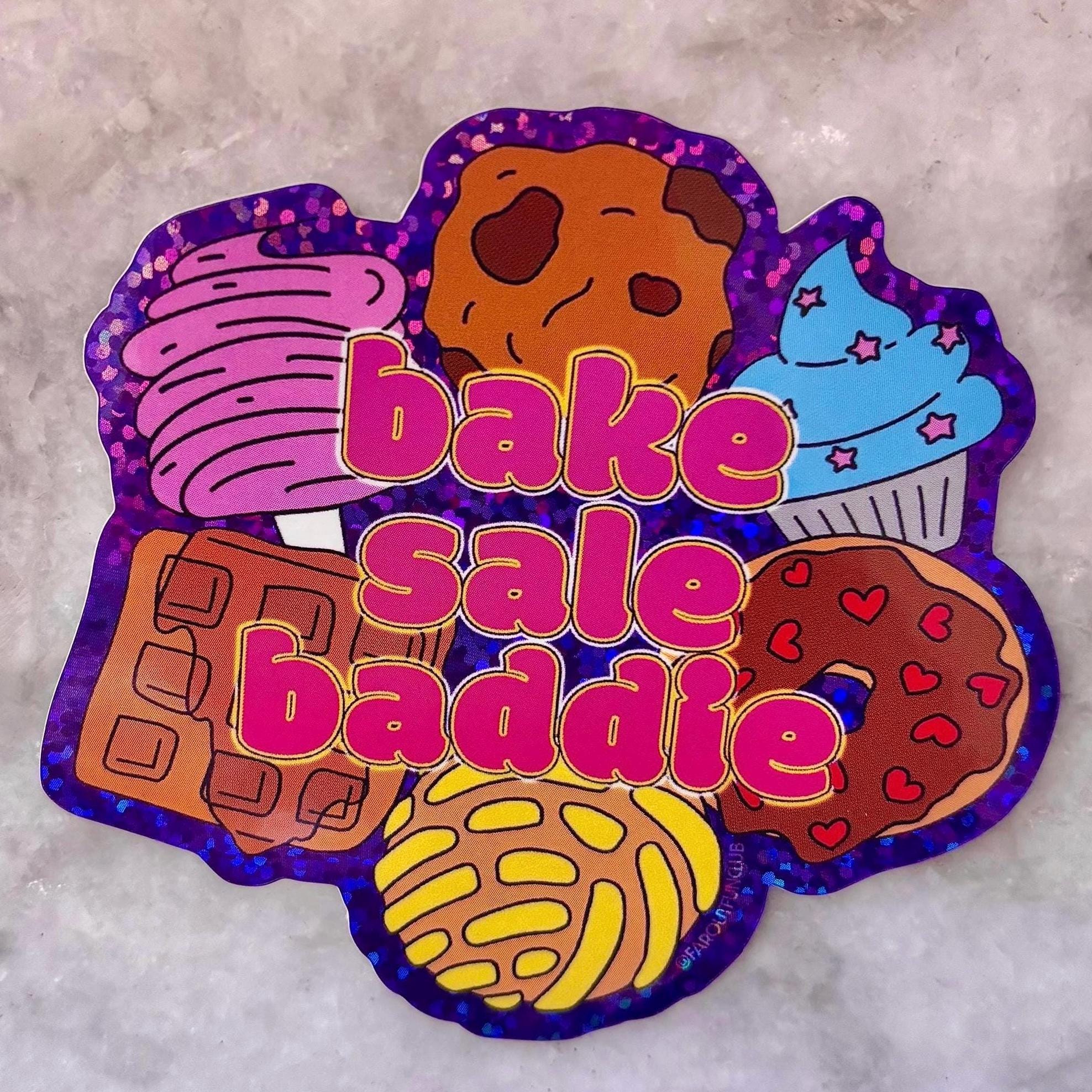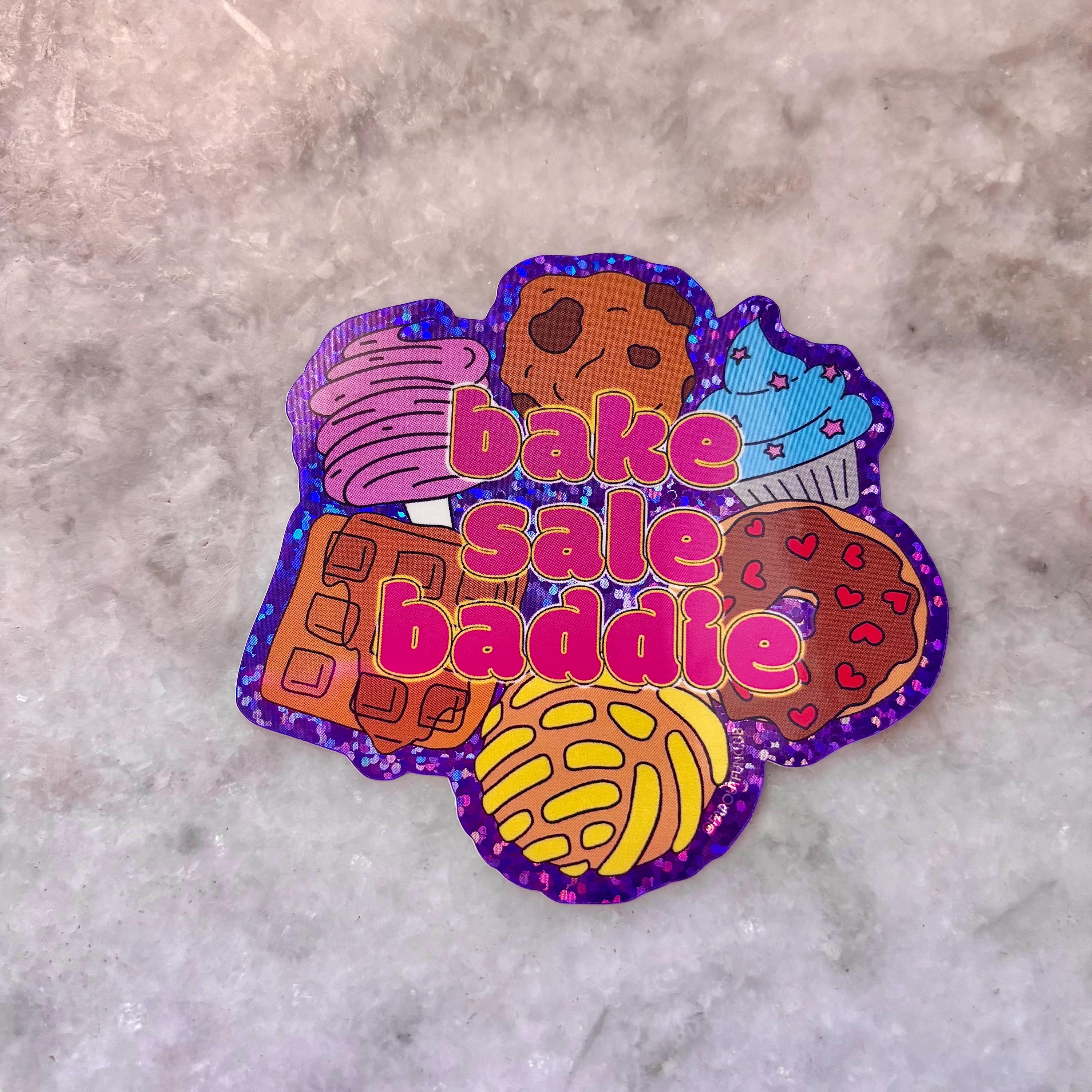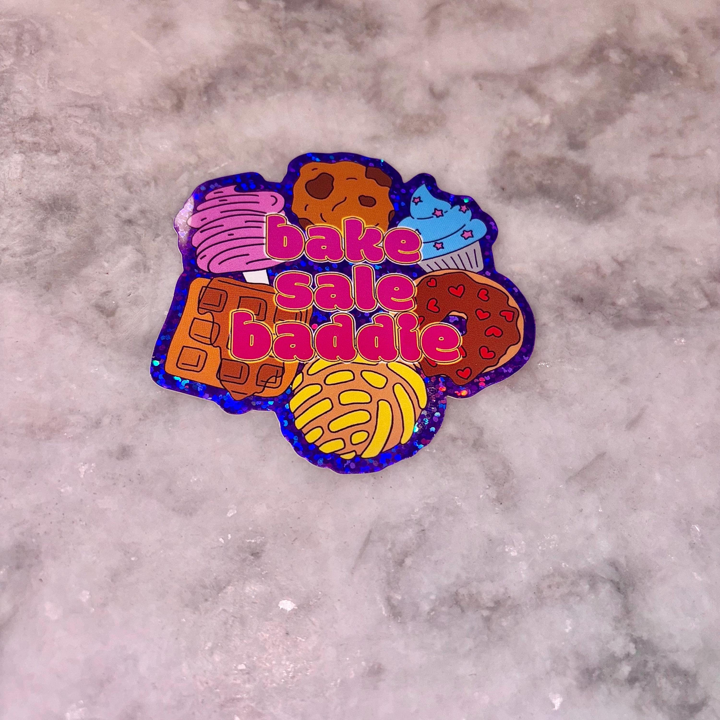 bake sale baddie glittery holographic sticker | for waterbottles laptops | concha waffle donut baked goods fan | cotton candy cupcake queen