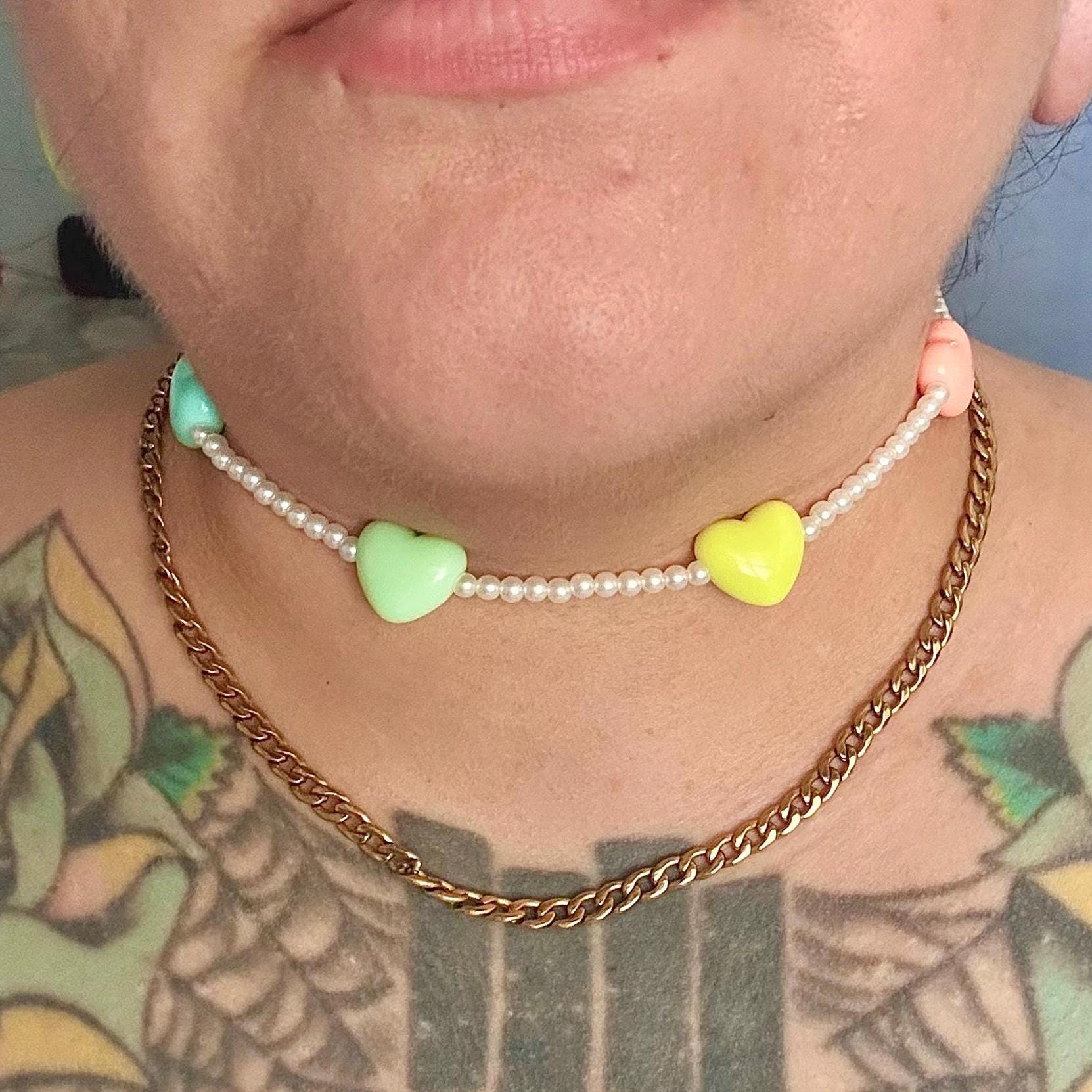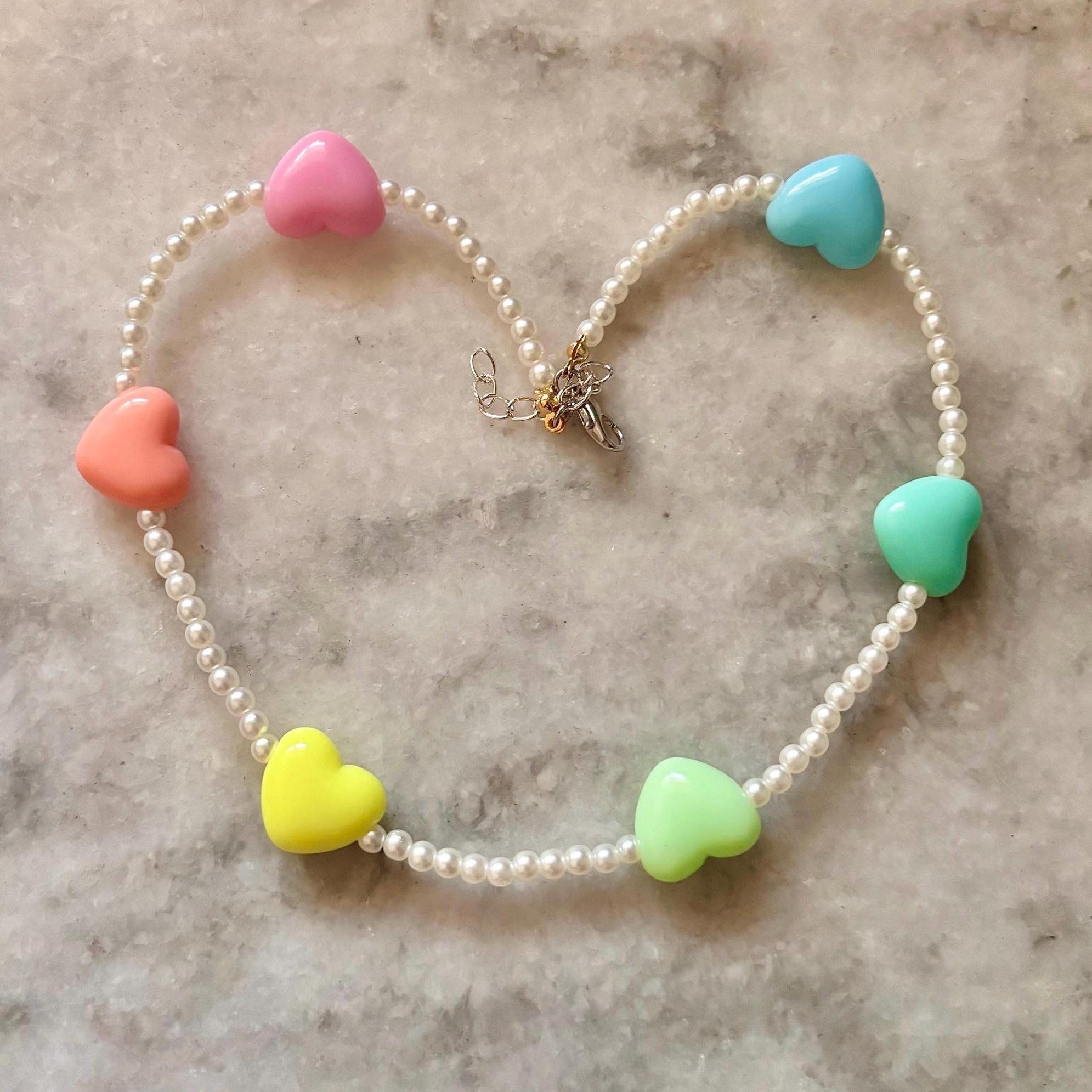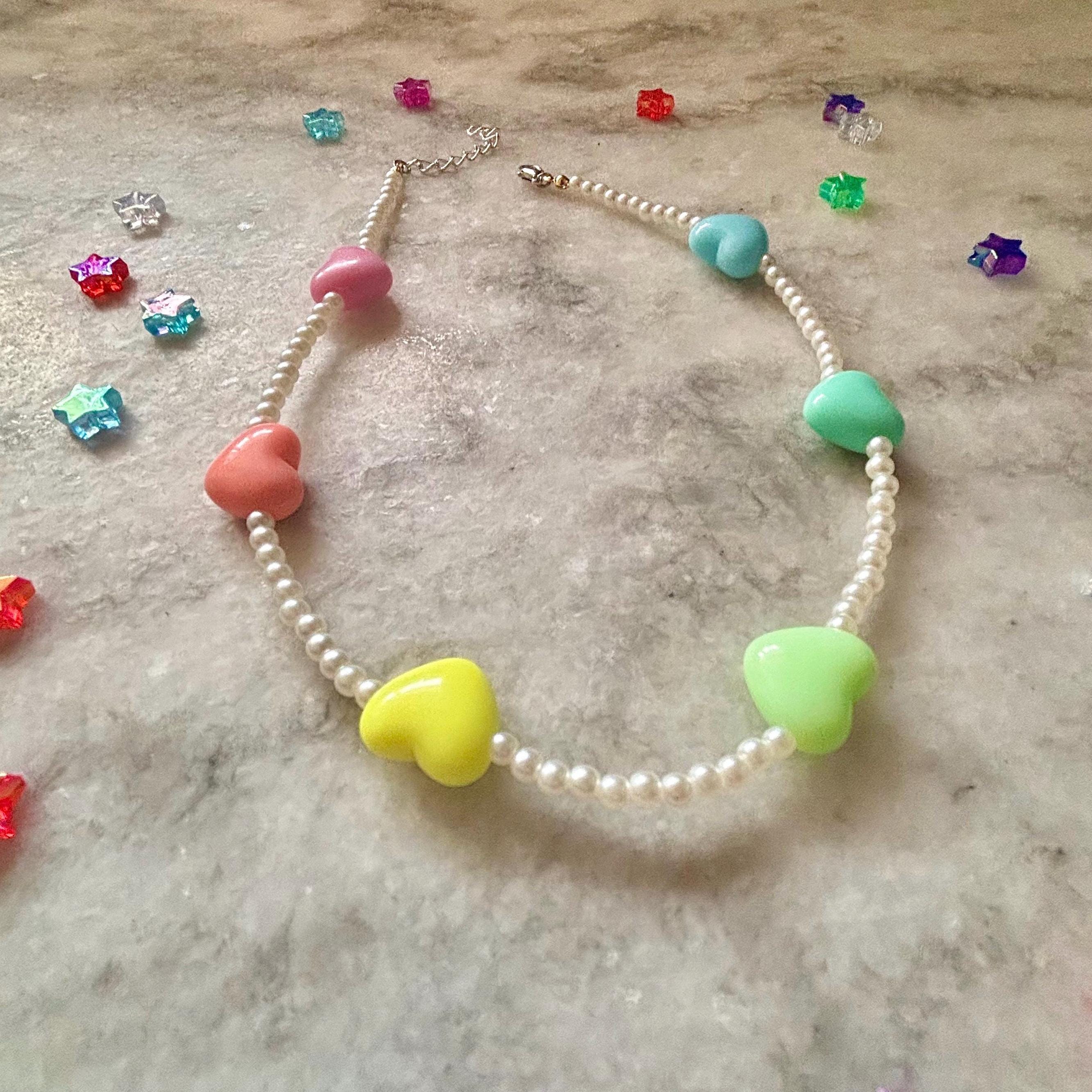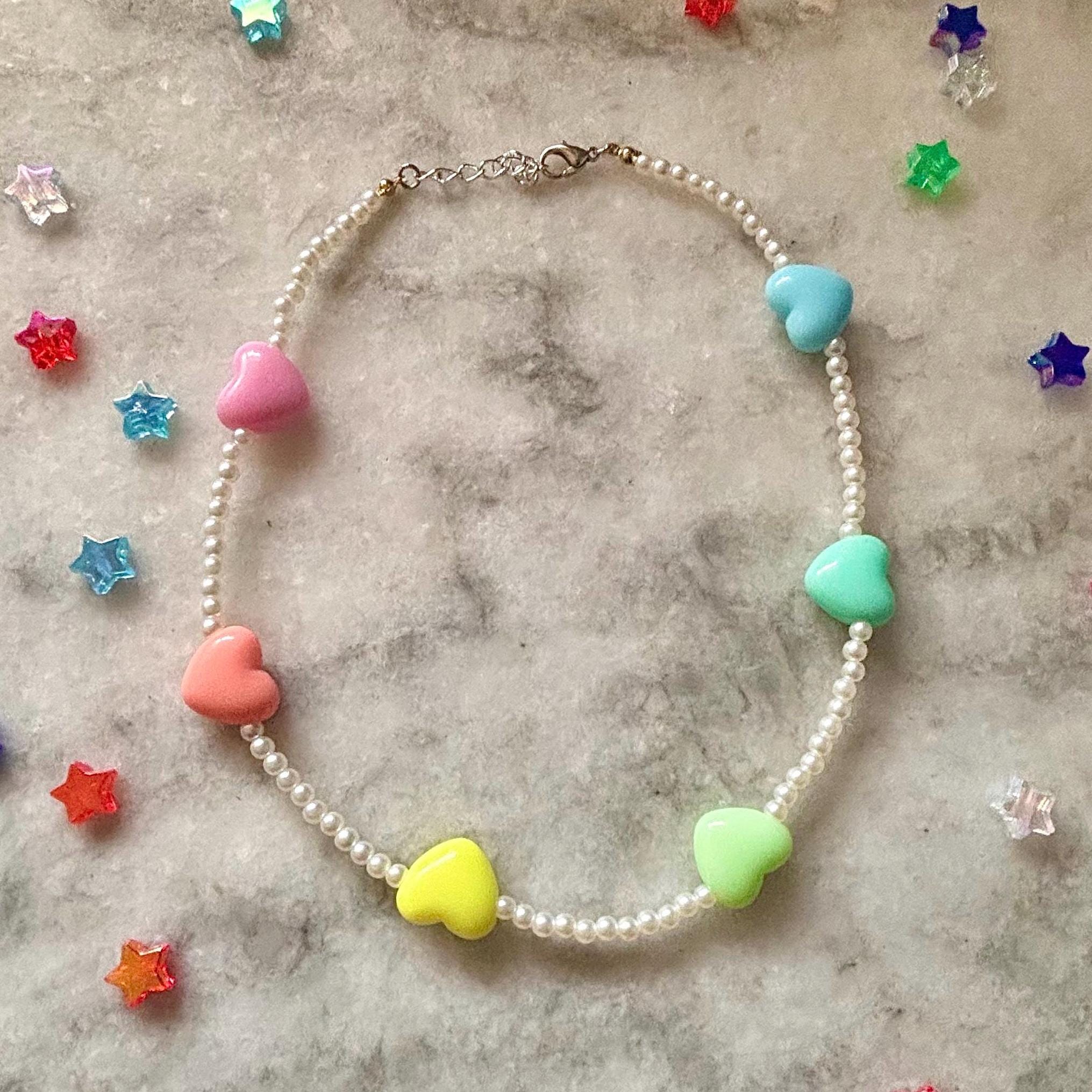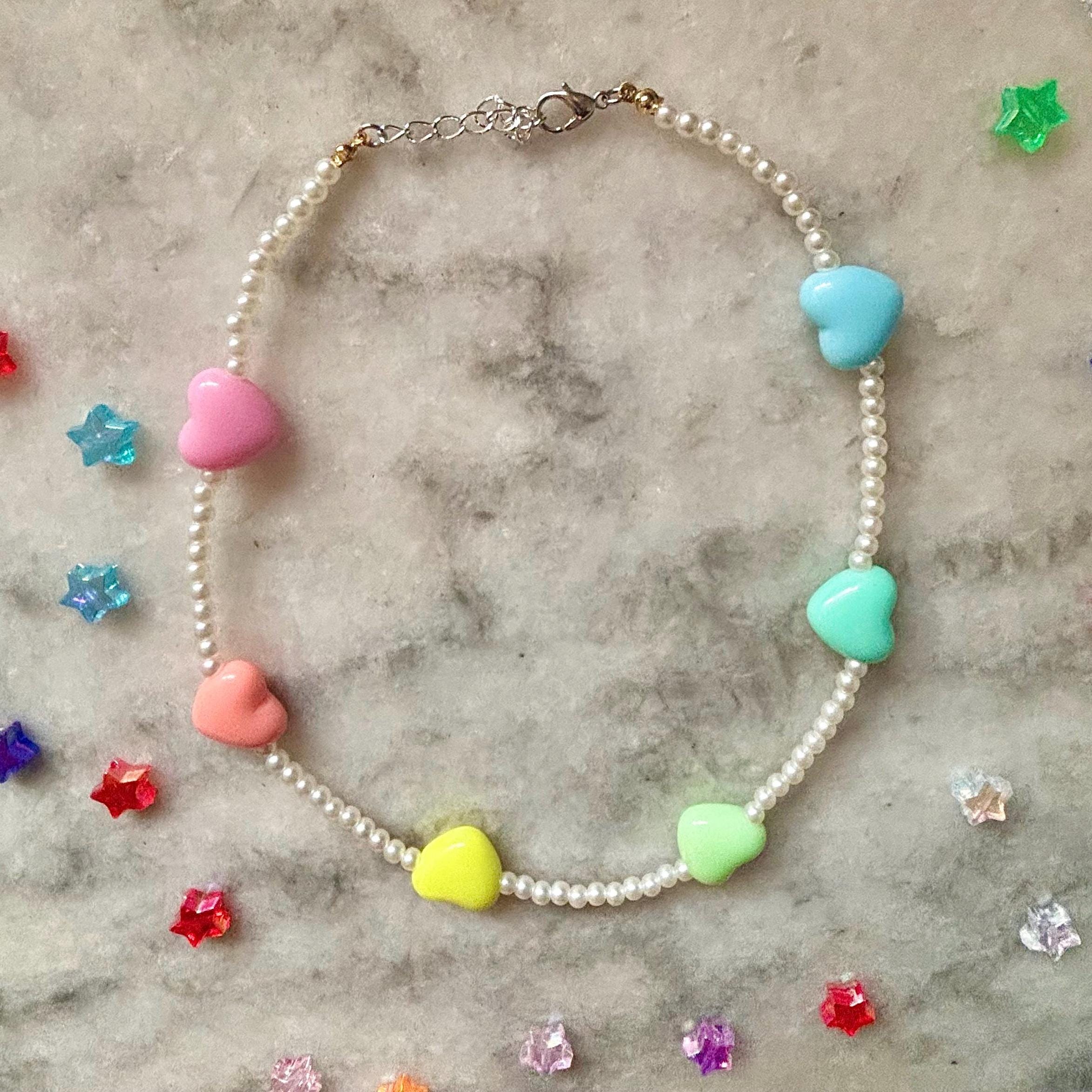 pastel rainbow heart pearl choker | kawaii jewelry for pastel princesses | whimsical mini pearl adjustable necklace | dreamy fantasy vibes
