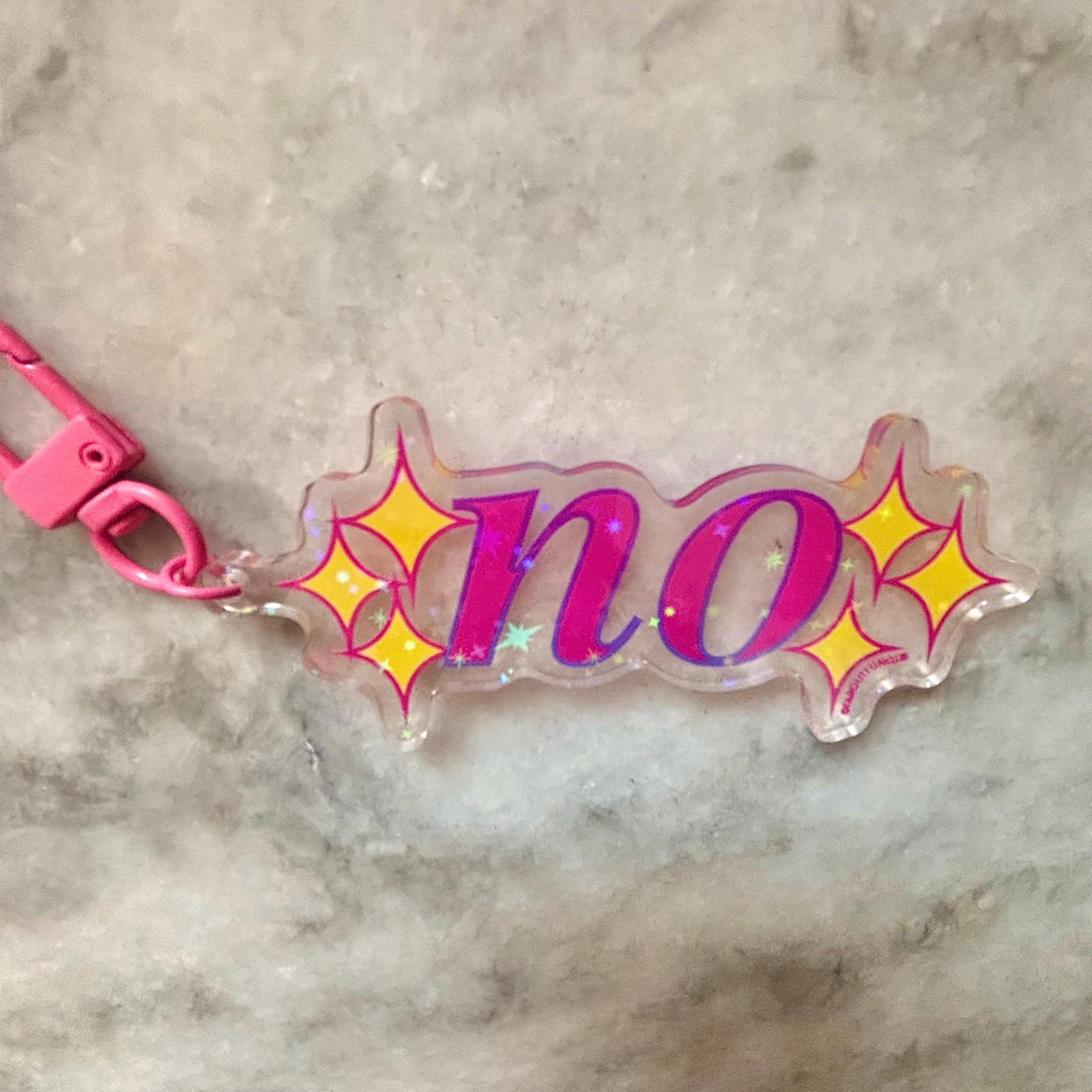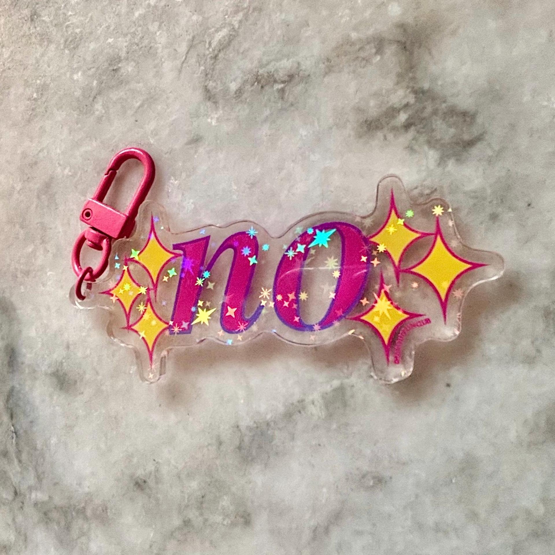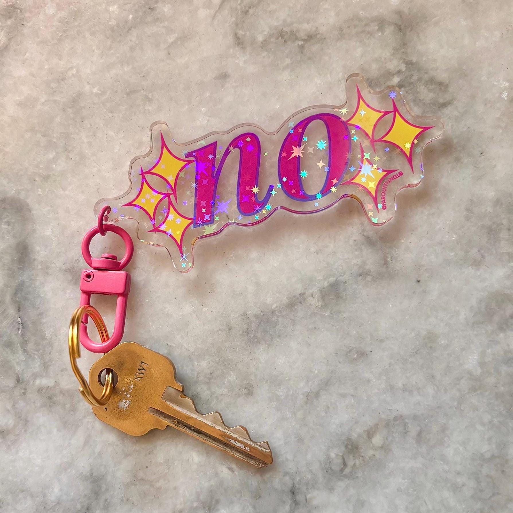 they’re finally here!!! based off my best selling sticker and ready for action, this ✨no✨keychain is really going places 🤩 front side features holographic star layer for extra sparkle in the event of showing it off OR laying down the law. if only setting healthy boundaries could always be this fun & easy…