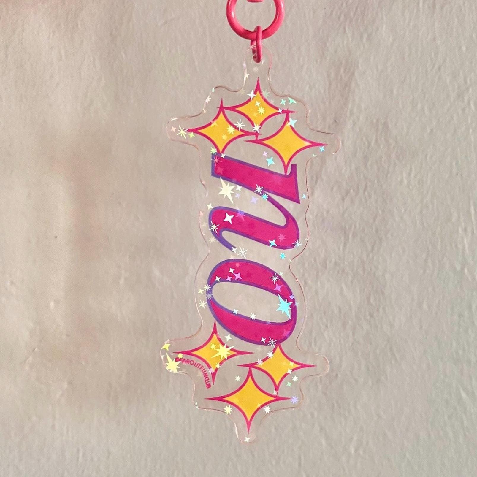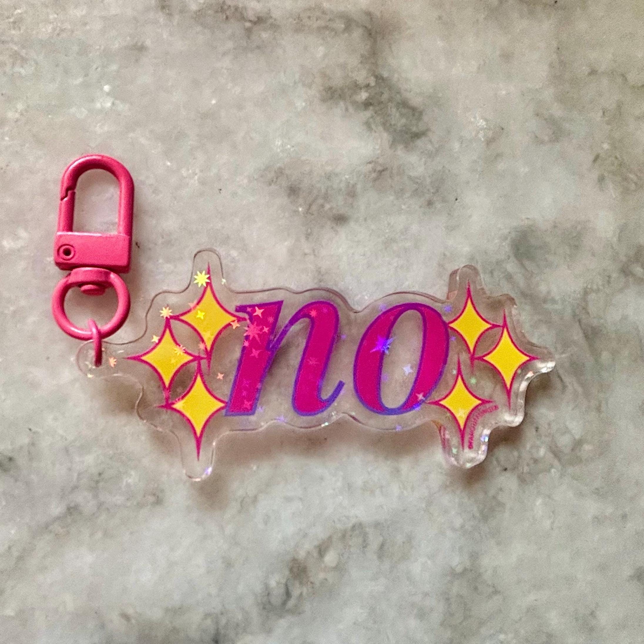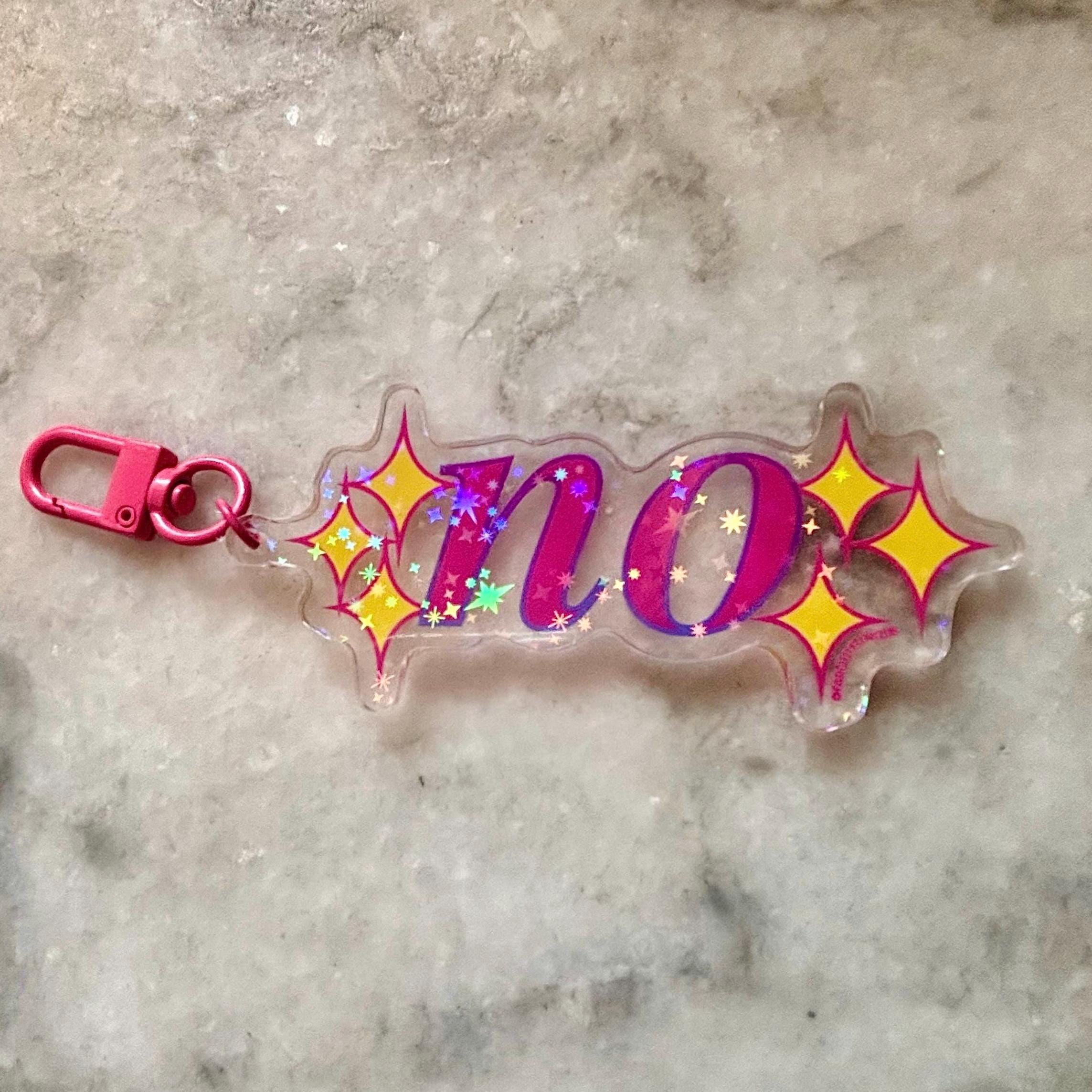 they’re finally here!!! based off my best selling sticker and ready for action, this ✨no✨keychain is really going places 🤩 front side features holographic star layer for extra sparkle in the event of showing it off OR laying down the law. if only setting healthy boundaries could always be this fun & easy…